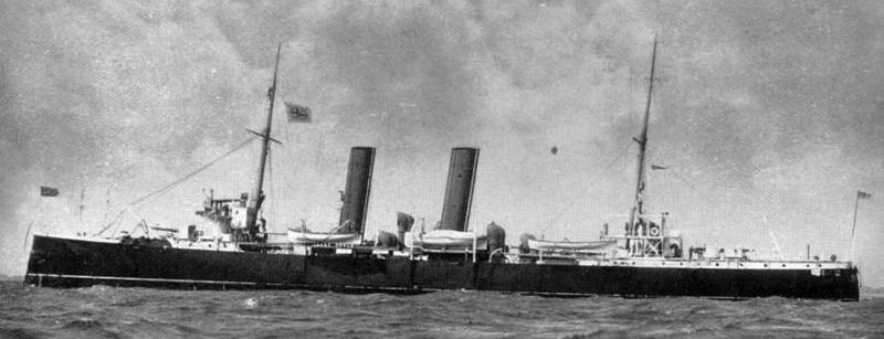 The H.M.S. Melampus was a second class cruiser of the Aeolus class in the Royal Navy stationed at Kingstown as a coastguard ship. Launched 2nd August 1890 she was originally built for the Greek navy when the order was cancelled. Displacement: 3,600 tons. Horse power: 9,000. Length: 300’ Beam: 43’8” Draught: 17’6” armament: two 6” guns, six 4.7” guns, eight 6-pounder guns and one 3-pounder all quick-firers. Speed 19.7 knots. Compliment: 275.