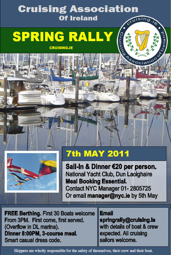If you are interested in attending the rally:It is essential that you book directly with the National Yacht Club on 01- 2805725 or by email to manager@archived.nyc.ie to ensure places at the meal for you and your crew.Please also email your name & details to springrally@cruising.ie  so that we know how many yachts/crew to expect. The Cruising Association AGM will be held in the JB Room from 19:00 – 19:30 for CAI members interested in attending.CAI poster for Spring Rally in NYC