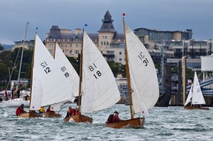 On Saturday morning the weather had not improved and there was a small craft warning. The programmed arrival of the Stena H.S.S. necessitated racing outside the harbour. A strong ebb tide was running and the Mollie Bawn took up station off the Forty Foot which was appropriate for Bloomsday. Jack Roy set a windward leeward course. The wind was up to 17 knots from the west with a short choppy sea. There is a skill in getting up-wind in a traditional boat with an overall length of only fourteen feet three inches in choppy conditions. It was Swift which won from Moosmie and Pansy. This was a race with a lot of place changing, as the tide and waves made for difficult racing conditions. Ian Matthews and Ken Poole in Marcia took Division 1B, and Good Hope Division 1B.