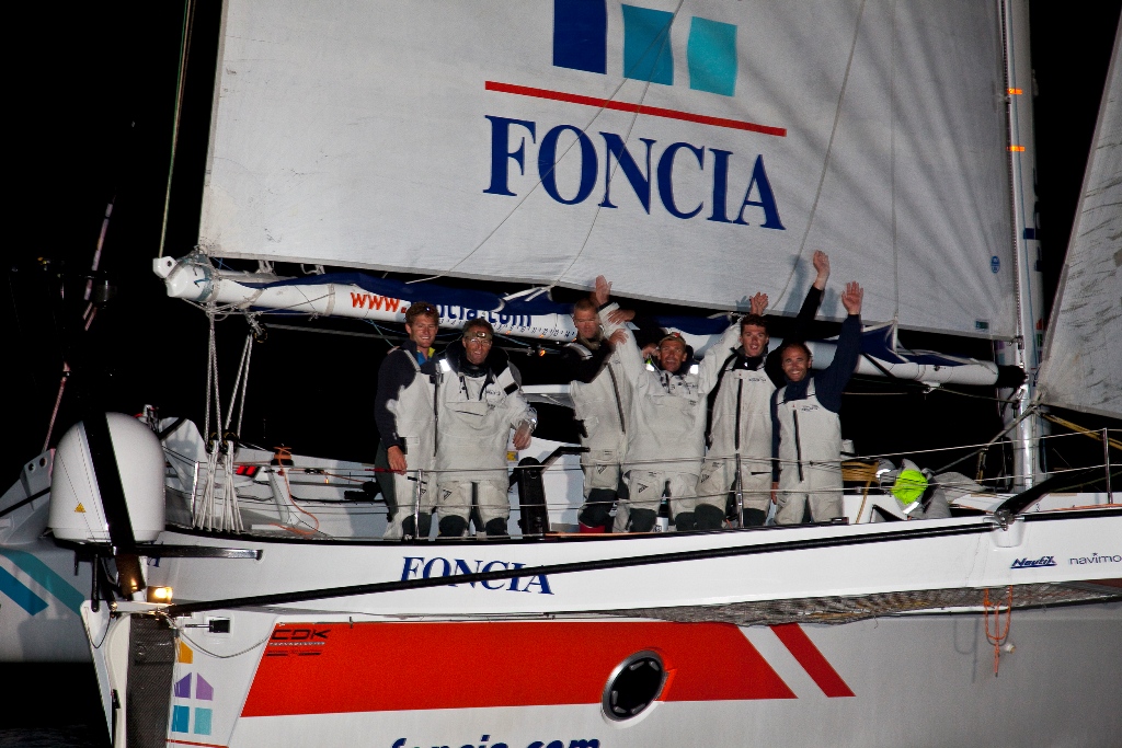 The fleet of MOD70 trimarans arrived in Dun Laoghaire in the early hours of this morning. Just 77 seconds separated the first 3 boats but Foncia skipperered by sailing legend ‘Le Prof’ Michel Desjoyeaux took the gun.