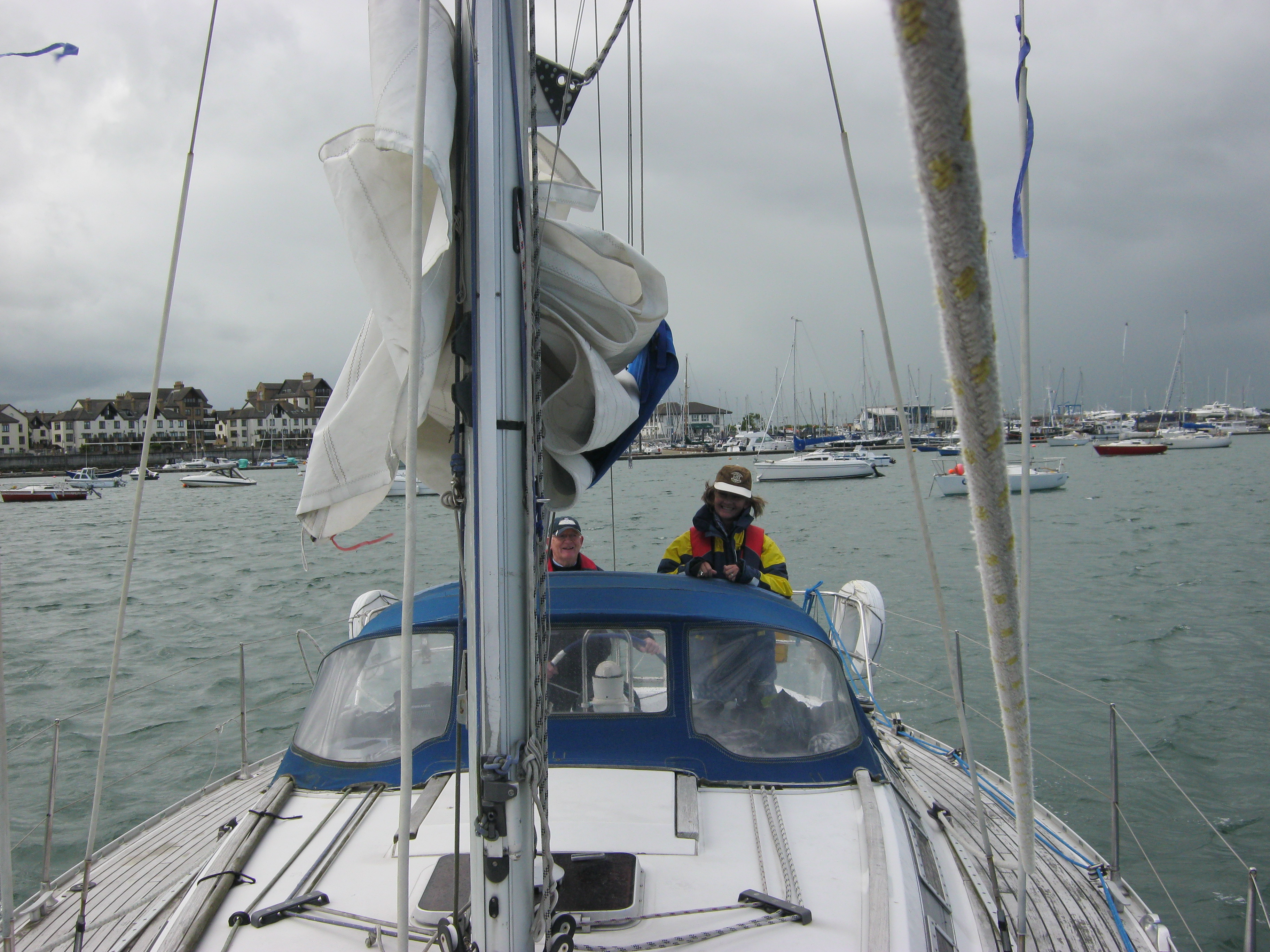 At 2pm on Sunday, we left the marina in 25 knots and had an exhilarating squally fetch to Howth / Baily. Some heavy showers hit us on the way, and Jester tore her headsail UV strip while trying to take it in a bit. In the midst of this, a coast guard launch came alongside asking if we were ok – very reassuring…we thanked them for their concern and continued on, rounding the Baily and hardening up for Dun Laoghaire, all the while keeping an eye on Hugo and Sue who were ahead of us.