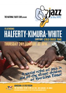Facebooktwitterredditpinterestlinkedintumblrmail Jazz at the NYC is delighted to announce a Charity Gig in aid of the street children of Burkina Faso with Halferty : Kimura : Whyte    Thursday 24th January at 8.00pm   National Yacht Club, Dun Laoghaire Halferty : Kimura : Whyte Lead by the renowned guitarist Tommy Halferty, along with pianist Azumi Kimura and bassist Derek Whyte, the trio brings a wealth of music, experience and influences from jazz and blues to classical and contemporary, to their entertaining performance.  With a focus on arrangements, improvised counterpoint and feel-good swing, their repertoire extends from Beatles to Bossa, with the fascinating addition of their own compositions. This highly interactive trio is sure to provide a fulfilling and imaginative musical experience for all. Support: Cold Duck Time Featuring: Mick McDonagh – Saxophone, Des Higgins – Guitar, Tony McGuire – piano, Brian Byrne – Bass, Brian Kelehan – Drums Admission €10 at the door.  For further information call 01-280 5725