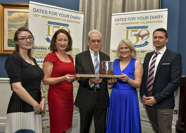Helen Cooney and Rosemary O’Connell, receive The Sue McDonnell Trophy which is awarded to the member who has contributed most to the advancement of women in Sailing. presenting the trophy is John, Sues Husband.