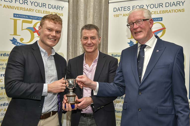 William Byrne, (Grandson) of JOHN BYRNE receives The John Byrne memorial trophy (1989) from his Father Rory, and the Commodore Martin Mc Carthy. It is awarded to the member who achieves the greatest contribution to sailing in the NYC during the year