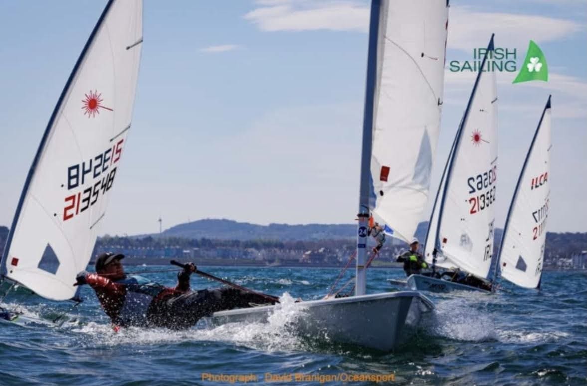 The Irish Sailing Youth National Championships were hosted at the Ballyholme Yacht Club from 22nd  to the 24th April in sunny but very mixed sailing conditions, with the third day in particular being very challenging. This event is special as it gives the young sailors the opportunity to see the various pathways they may take after the Optimist Fleet. On day 2 the Optimist and ILCA6 classes launched at the same time in very challenging conditions with both classes literally sailing on crests of waves as they sailed out into Belfast Lough.