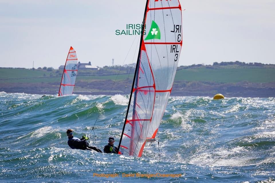 The Irish Sailing Youth National Championships were hosted at the Ballyholme Yacht Club from 22nd  to the 24th April in sunny but very mixed sailing conditions, with the third day in particular being very challenging. This event is special as it gives the young sailors the opportunity to see the various pathways they may take after the Optimist Fleet. On day 2 the Optimist and ILCA6 classes launched at the same time in very challenging conditions with both classes literally sailing on crests of waves as they sailed out into Belfast Lough.